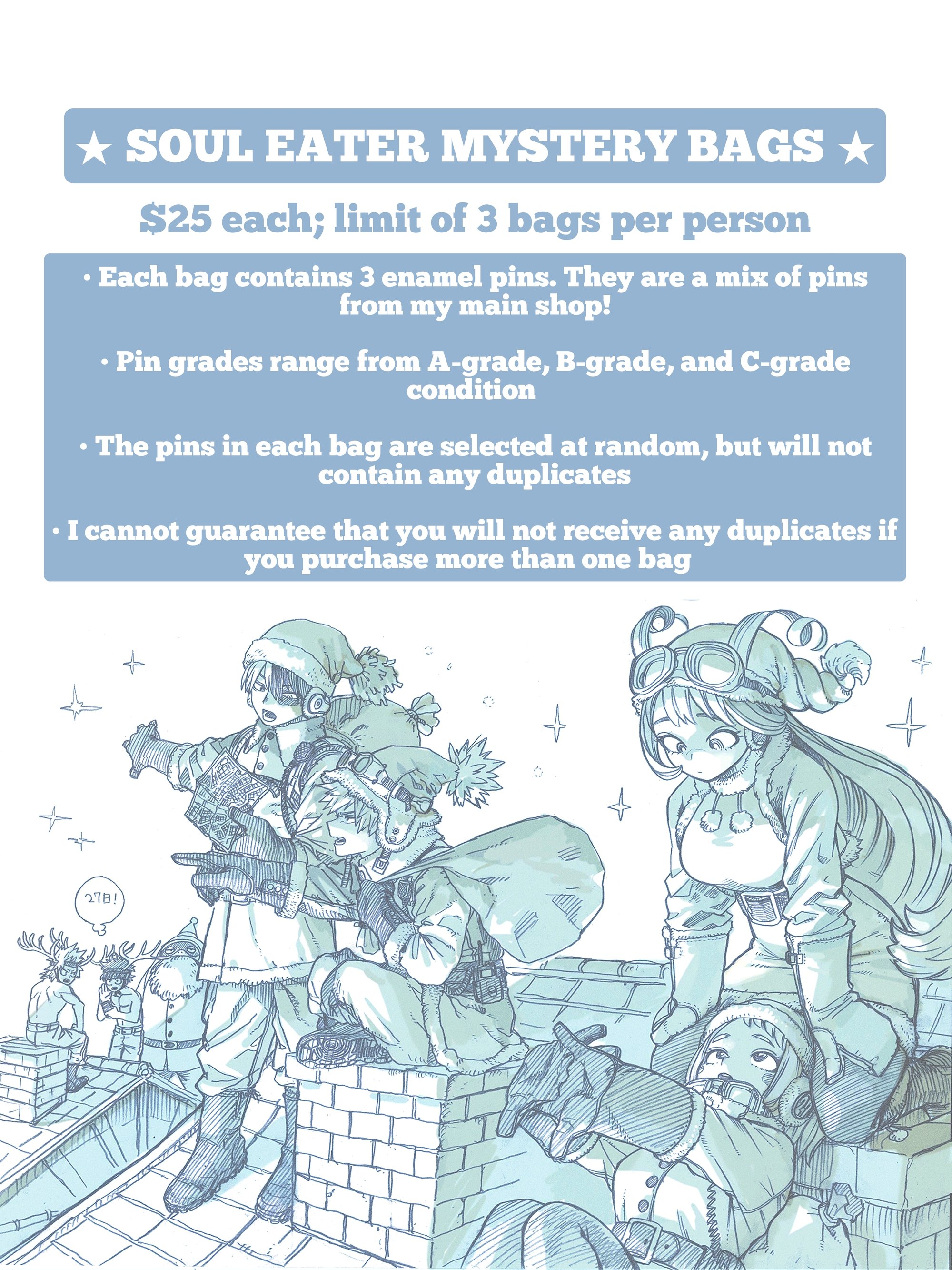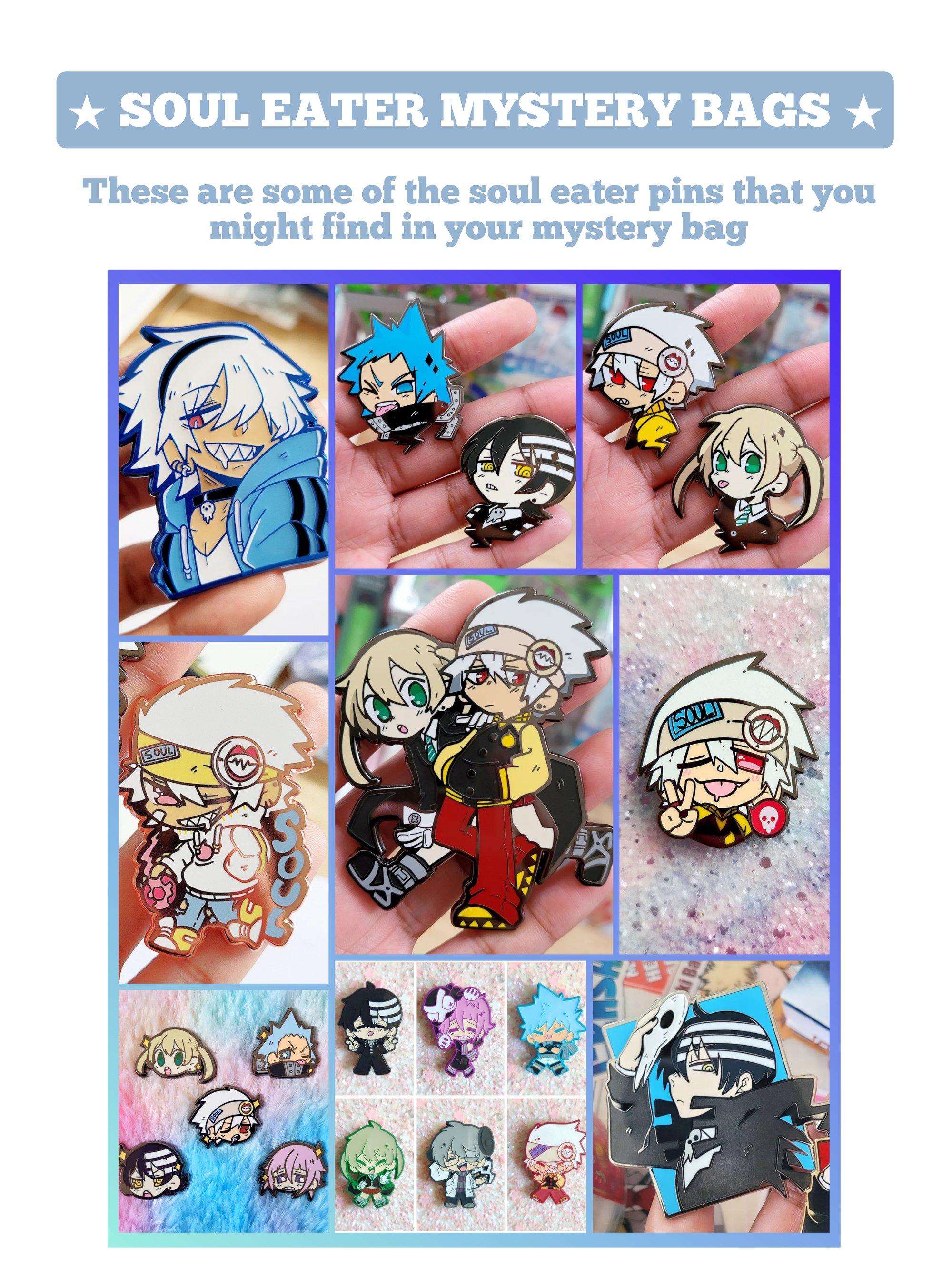 Mystery bags are divided by fandom: BNHA and SOUL EATER. The BNHA bag will only have BNHA pins, and the Soul Eater bag with only have Soul Eater pins!